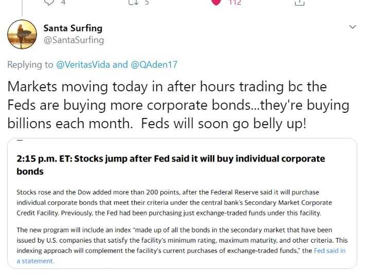 Anoche, el Dow estuvo activo después de horas de negociación debido a las noticias de que la Reserva Federal está comprando más bonos corporativos. La Reserva Federal está comprando miles de millones en bonos corporativos para ayudar a salvar a Estados Unidos. Es interesante ver cómo el presidente de la Reserva Federal no se destaca y hace ningún anuncio. Todo esto se relaciona con lo que está por venir ... ¡el destino de la Reserva Federal!